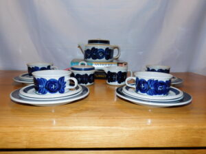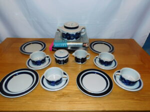 An Arabia of Finland ” Anemone ” pattern hand painted part tea service including a teapot, milk jug, sugar pot, 4 side plates, 4 tea cups and 4 saucers. In good condition, no chips or cracks. This set would make a wonderful addition to your collection if that is as art or for special occasion usage.